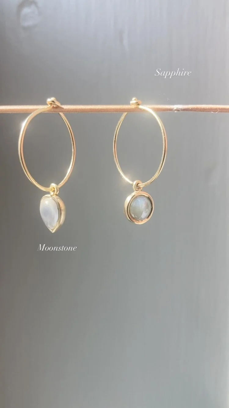 moonstone & sapphire ear hoops in 18ct yellow gold